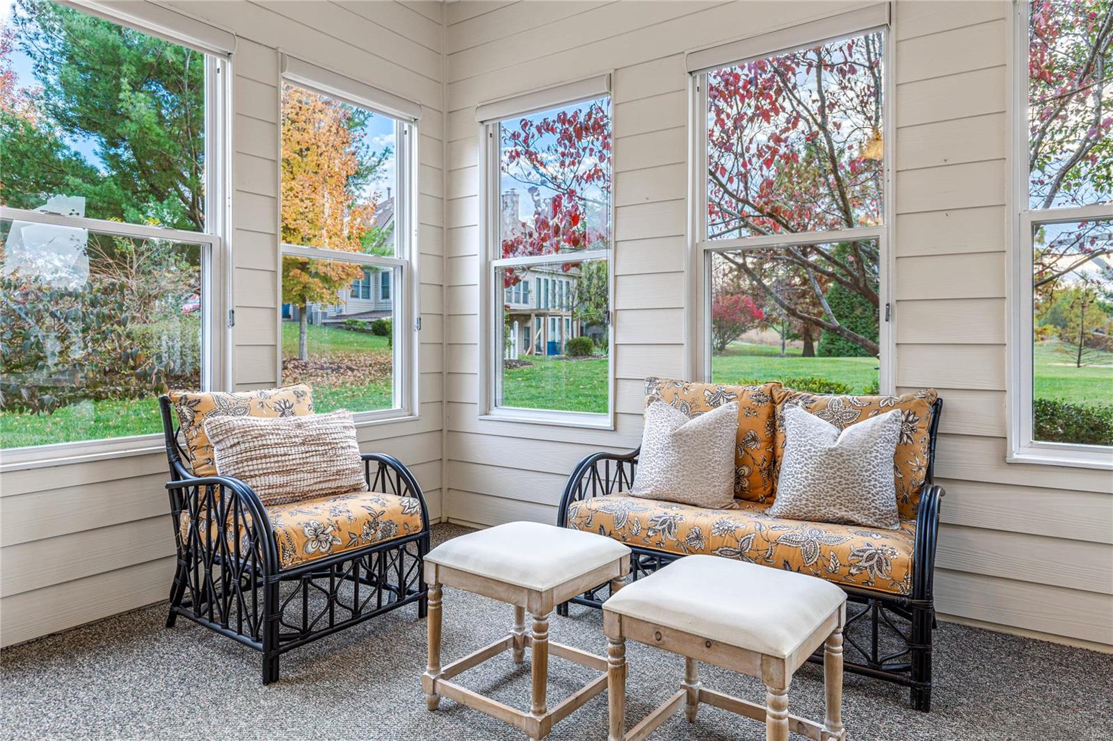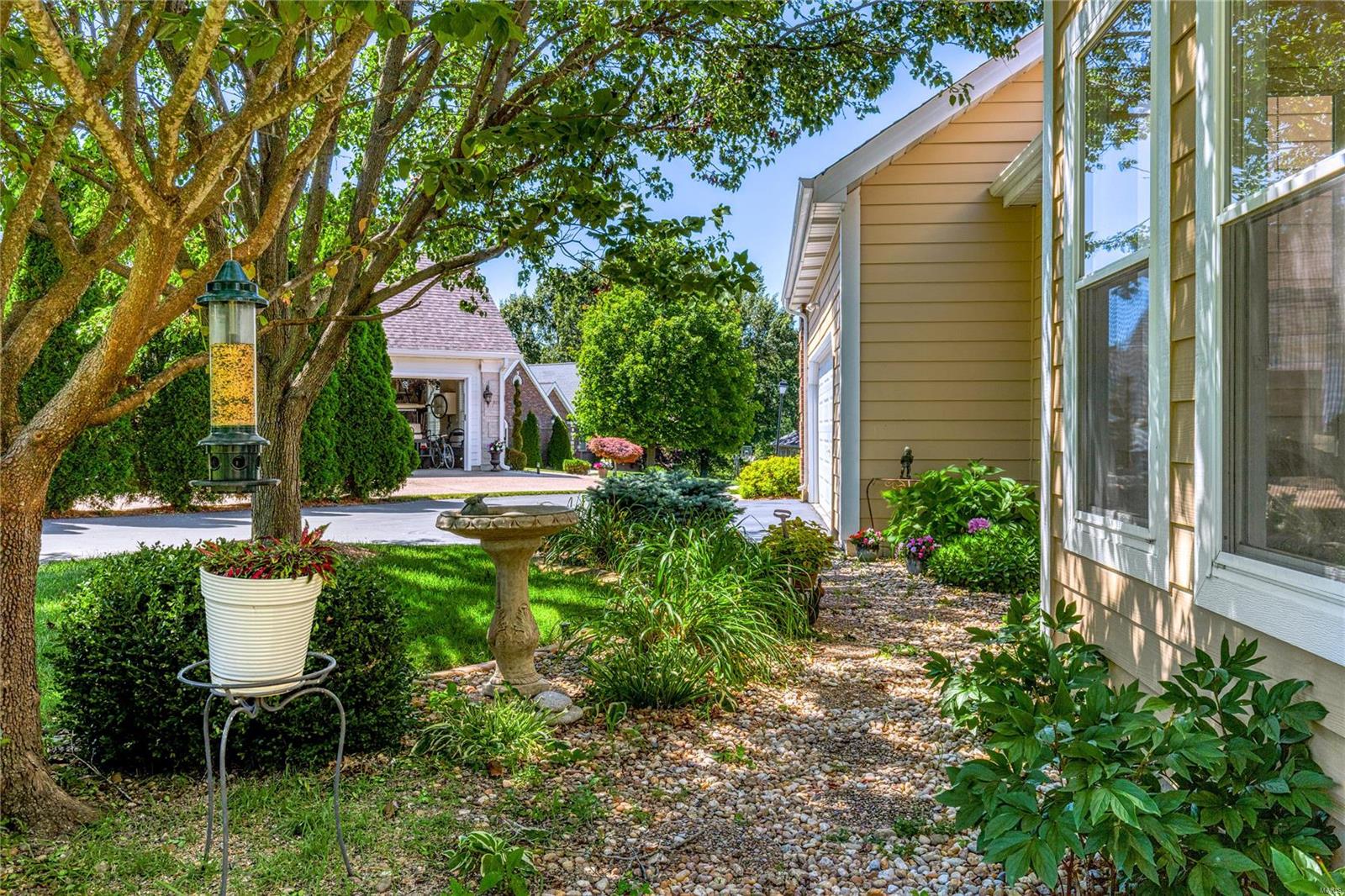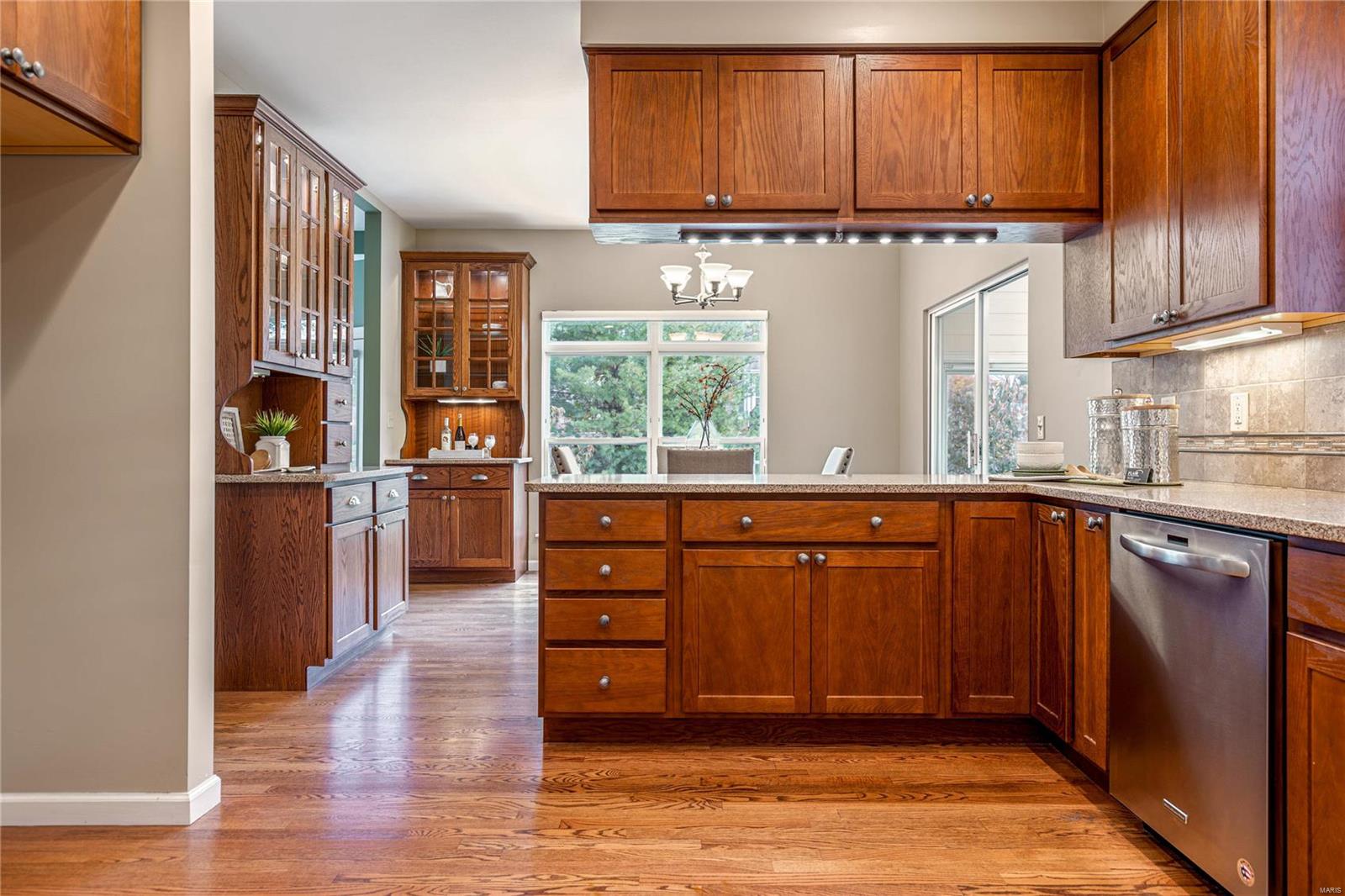 This spacious brick great room ranch features an open floor plan with soaring ceilings, oak hardwoods & detailed trim work. Vaulted entry foyer leads to formal dining room framed by architectural columns & stunning great room with cathedral ceiling, skylights & see-through marble fireplace. Chef's kitchen with 42" oak Shaker cabinetry, granite countertops & center island adjoins light-filled breakfast room with built-in breakfronts, sun porch & step-down hearth room with fireplace & wide bay window with atrium door that opens to patio. Primary bedroom suite offers an appealing retreat with luxury bath & French doors to hearth room. 2 Additional bedrooms & hall full bath complete the main floor living quarters. Lower Level includes recreation room & game room plus office & full bath. Situated on a private cul-de-sac lot with aggregate patio surrounded by landscaped gardens & 2-car garage. Golf community lifestyle with access to clubhouse, pool, tennis courts & championship golf course.
