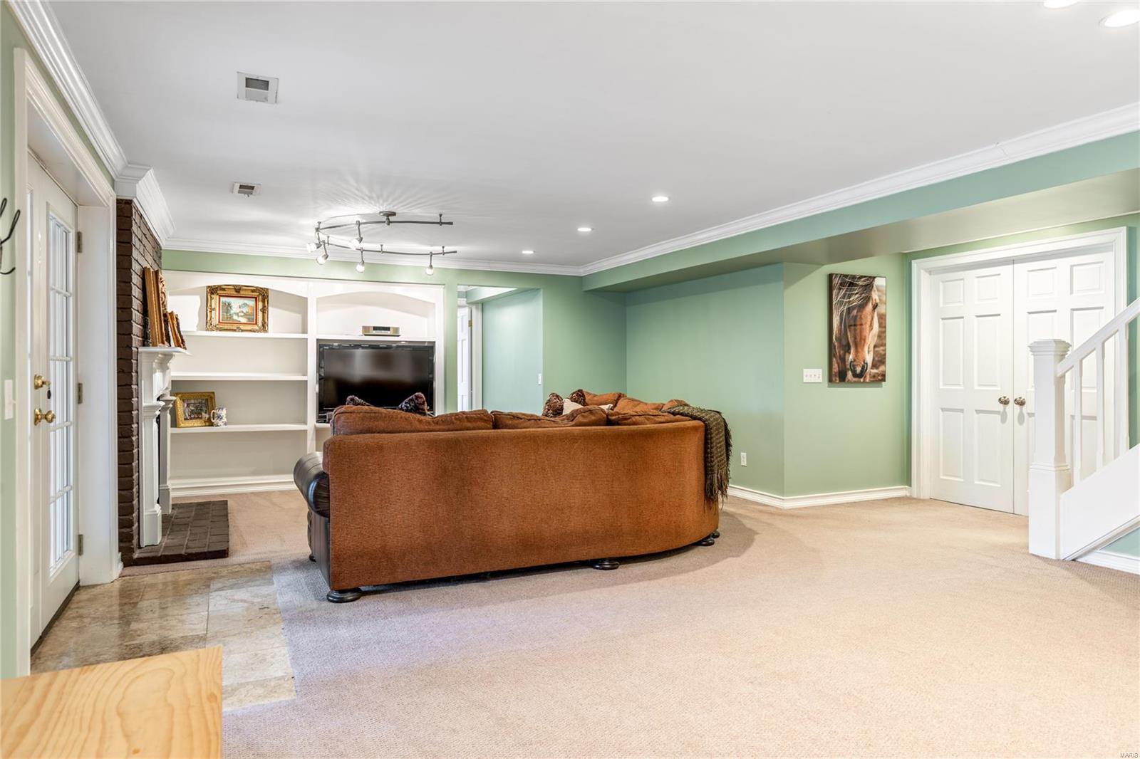 Full-brick ranch home beautifully renovated throughout. Classic center hall floor plan features light-filled rooms with detailed trim work, freshly painted interiors & oak hardwoods that extend throughout the main floor. Gracious entry foyer leads to formal living & dining rooms with full-height windows and spacious family room with floor-to-ceiling brick fireplace & sliding glass door that opens to private deck that overlooks tree-lined backyard. Updated kitchen is a chef's delight with glazed white cabinetry, quartz countertops, KitchenAid appliances & 7' center island. Primary bedroom suite with Travertine marble bath plus 2 additional bedrooms & hall full bath with jetted tub complete the main floor living quarters. Oak staircase accesses walk-out Lower Level with recreation room with fireplace & built-in bookcases, 4th bedroom & half bath. Grounds include deck, covered patio & fully fenced backyard. Neighborhood community with clubhouse & pool. Award-winning River Bend Elementary.